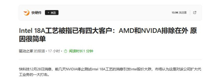 驱动之家:Intel 18A工艺被指已有四大客户:AMD和NVIDA排除在外 原因很简单